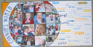 When Connor was a year old, I wanted to make summary pages for several months of activity. At the time, I was a tax accountant and one of the magazines that was routinely on my desk was the Journal of International Taxation. The cover of that magazine just happened to always have a globe overlay on its cover. I knew I wanted to make it into a layout, but it took me a while to figure out how I'd do it. Then the layout itself, well, by the time I did all of the work in PSE to make the template shapes, sized the photos, cut and assembled them, pretty darned near took forever.